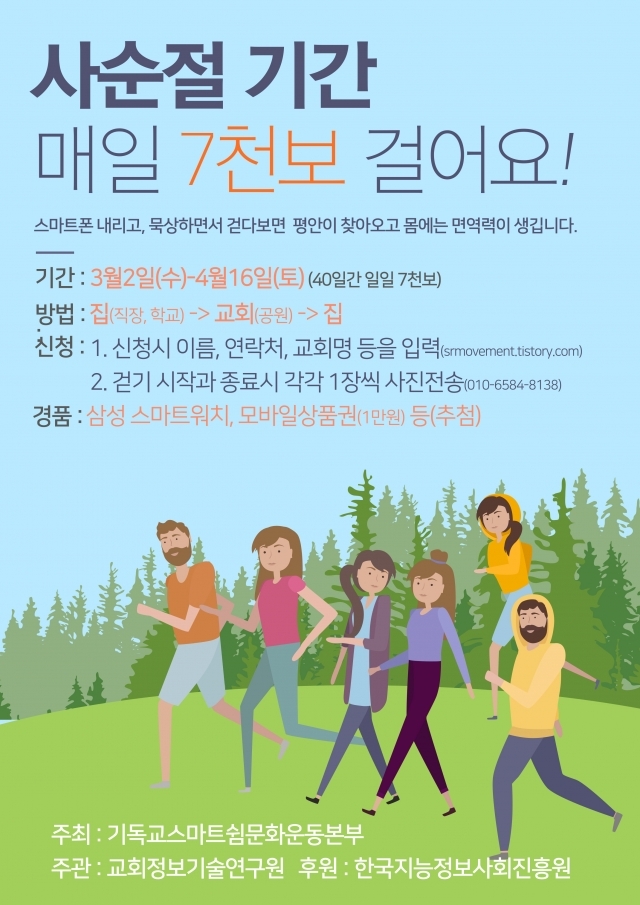 기독교스마트쉼문화운동본부(이사장 양병희 목사)는 지난 2일부터 ‘사순절 걷기 캠페인’을 진행 중이다.다음 달 16일까지 진행하는 이 캠페인의 참가 대상은