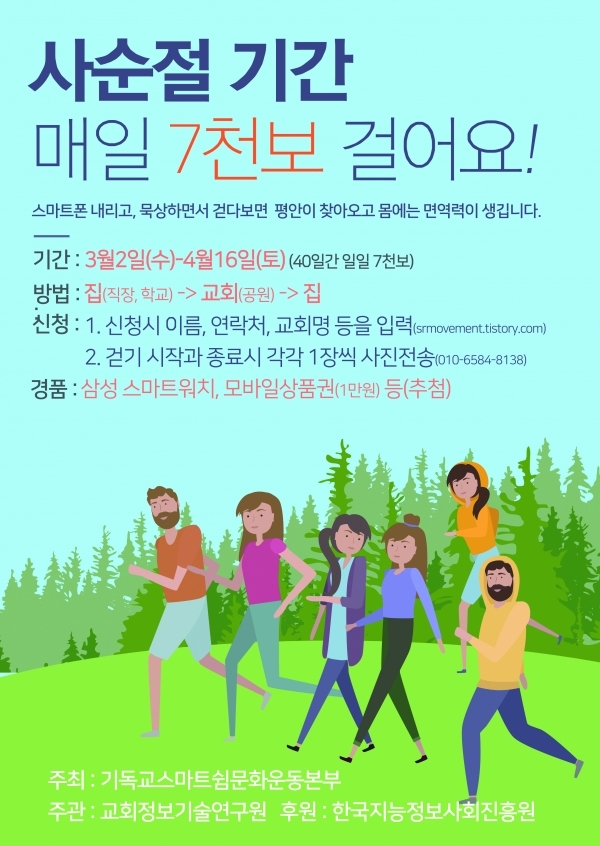 ‘스마트폰 쉼’ 캠페인 참여 대상은 기독교인 성인 및 학생, 목회자로 온라인 신청 후 첫 걷기 인증 사진과 종료 인증 사진을 문자로 보내면 된다. 인증 방식은 참여자가 걷고 있는 모습을 직접 ‘셀카’로 찍거나 촬영 후 보내면 끝. 집에서 출발하거나 학교 혹은 직장에서 출발해도 된다. 별다른 조건 없이 하루 7천 보만 걸으면 된다. 단, 행사의 취지가 ‘걷기’ 자체보다 스마트폰을 잠시 내려놓는다는 것에 있는 만큼 걷는 시간 동안에는 스마트폰 사용을 멈추고, 기도하는 마음으로 걷는 것을 권유하고 있다. 캠페인 참가자들을 위한 경품도 마련했다. 삼성 스마트워치와 모바일 상품권(1만원) 등이 준비돼 있으며, 행사종료 후 추첨을 거쳐 당첨자에 한해 기독교스마트쉼문화운동본부 홈페이지(https://srmovement.tistory.com)에 공지할 예정이다.