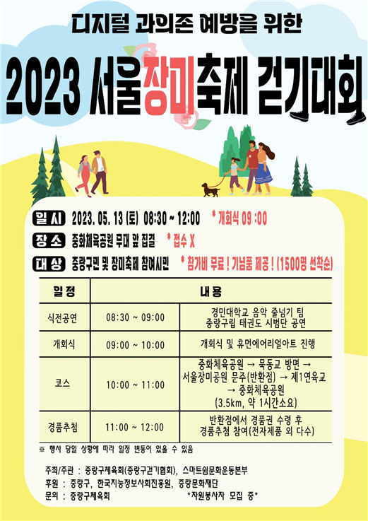 서울에서 가장 예쁜 축제라는 슬로건아래 2023년 서울 장미축제가 “다시 꽃 중랑”이라는 주제로 5월 13일부터 21일까지 중랑 장미공원에서 열린다. 장미축제를 알리는 첫 행사인 걷기대회는 스마트쉼문화운동본부(양병희 대표)와 서울시 중랑구 체육회가 공동주최하고, 한국지능정보사회진흥원, 중랑구, 중랑문화재단이 후원으로 진행된다. 대회는 오전 9시 개회식으로 시작해, 중화체육공원부터 중랑천 일대 장미꽃 길을 약 3.5Km를 걷으면서 자연을 통해 힐링하고, 사람들과 어울리면서 다시 일상으로 돌아가는 알리는 신호탄이 될 것이다.